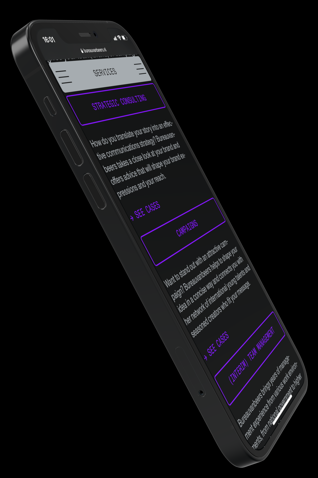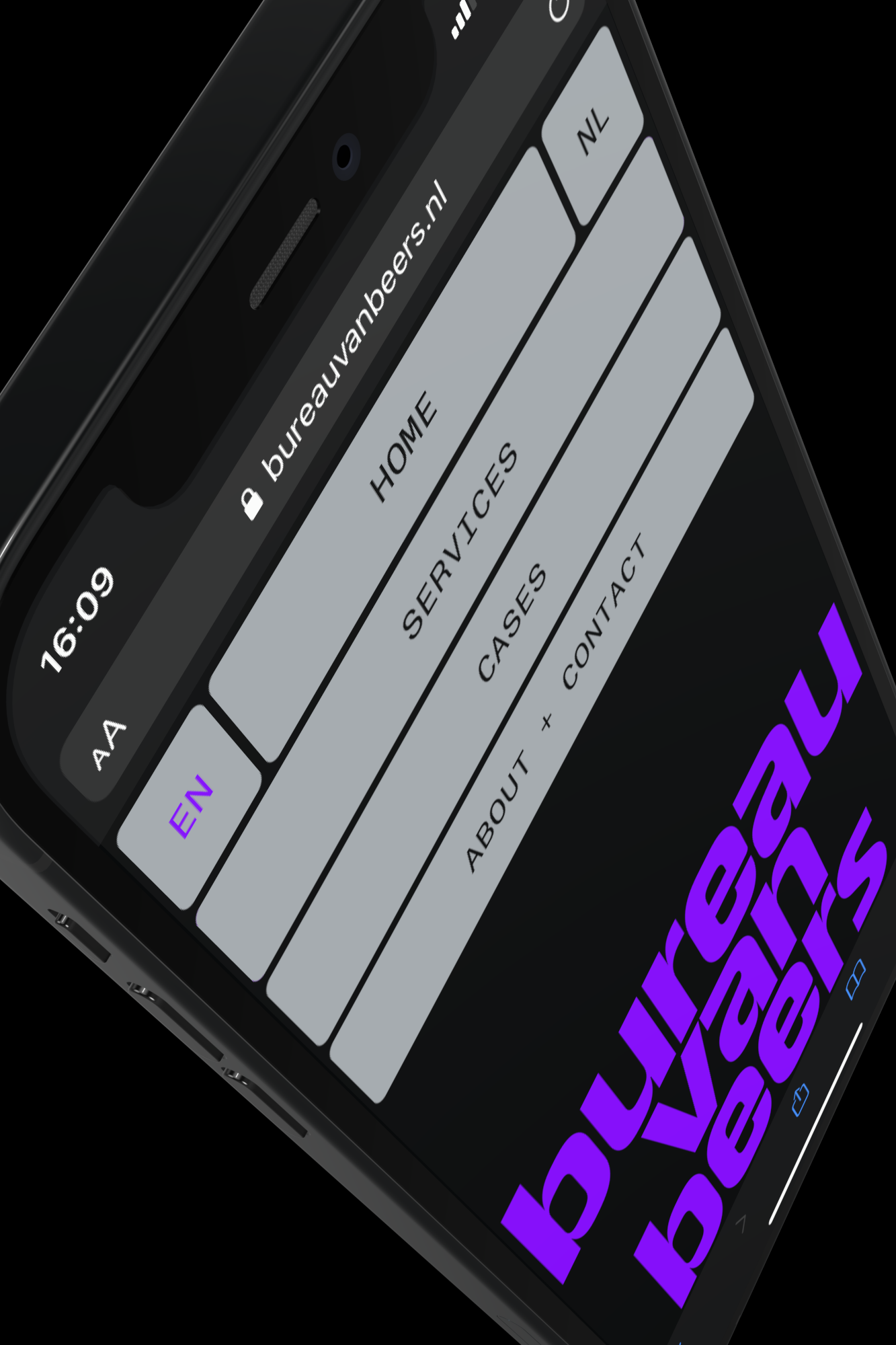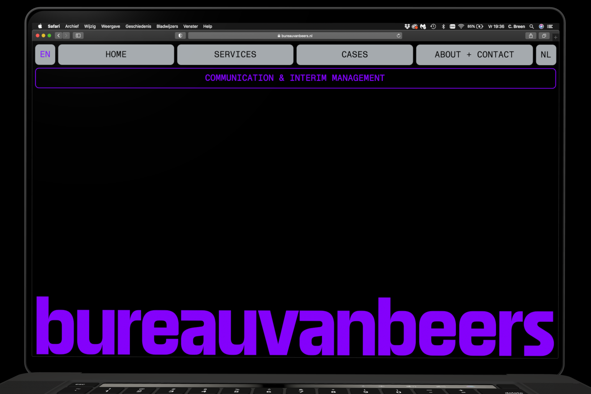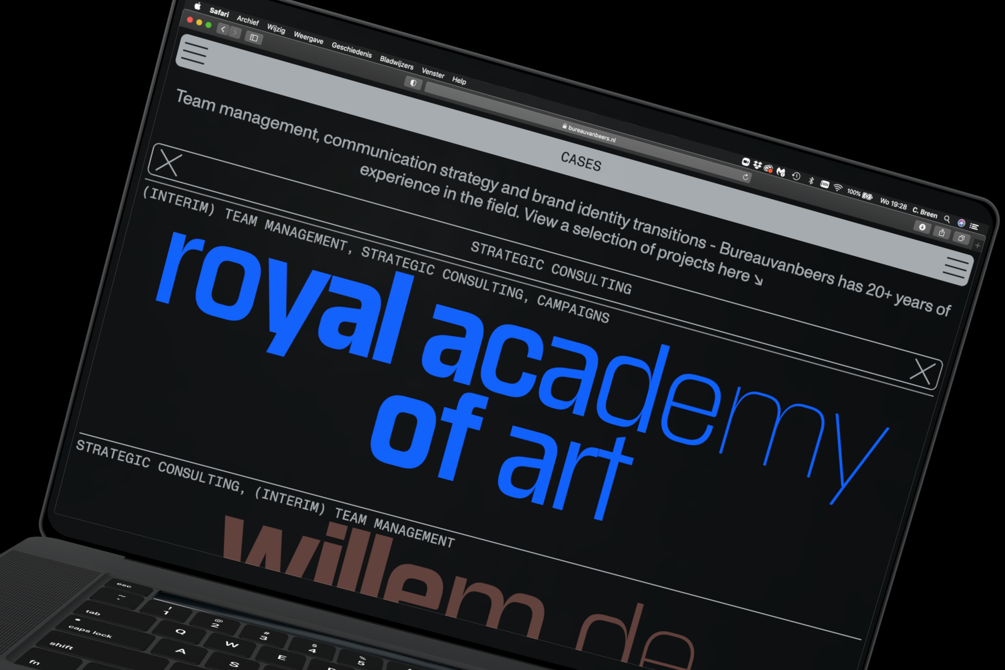Identity for the communication office of Nienke van Beers. Bureauvanbeers is specialized in communication and interim management for the contemporary art world and art education. An identity with interactive variable type that invites visitors not only to study the cases but also to play with them. Typefaces: SE Grotesk by Approximate Type and Monument Grotesk by ABC Dinamo. www.bureauvanbeers.nl