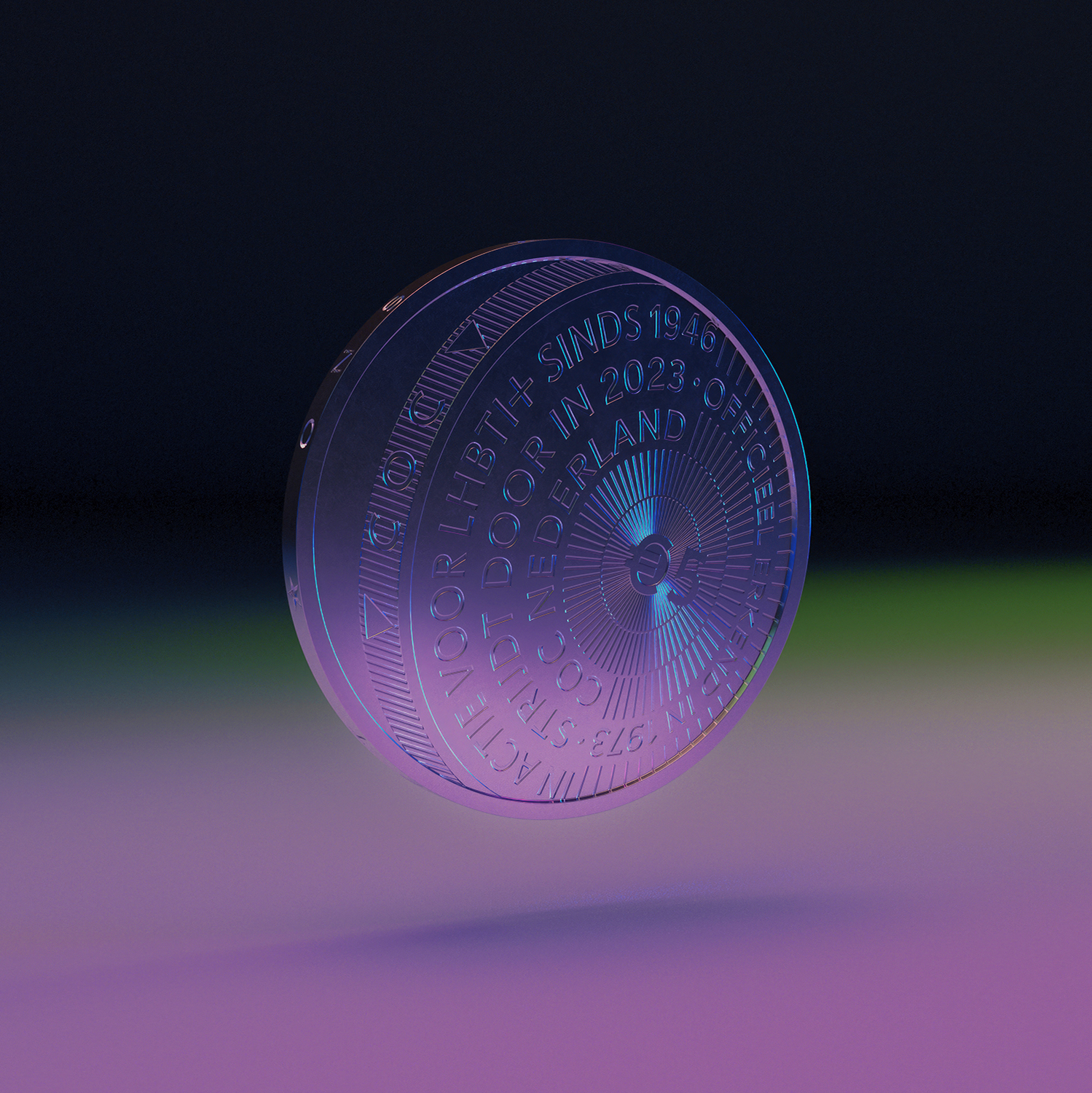 2023 marks the 50th anniversary of the ‘royal approval’ of the COC, the world’s oldest LGBTQIA+ rights organisation still in existence. Although the COC was founded in 1946, it was only recognised as a legal entity by the Dutch state in 1973. Fifty years on, the COC has had many triumphs, such as the recognition of gay marriage in 2001. Yet, despite such advances, there is still a long way to go, as continuing attacks on members of our community here and abroad show us. I was one of the designers asked to design a coin to commemorate the occasion of these fifty years. Many of us in the LGBTQIA+ community feel and are made to feel like misfits in this heteronormative society. I translated this to a coin which looks like it doesn’t fit into its mould. The coin within the coin has a different perspective. And yet, the rotation in the coin shows that this relation is dynamic, that the moulds and our positions within them, are changing. There is a hope that one day the mould will accommodate us too. Typeface: Tonka by Céline Hurka & Huw D. Williams. Renders by Wang & Söderström.