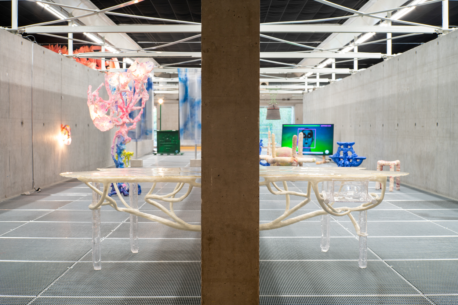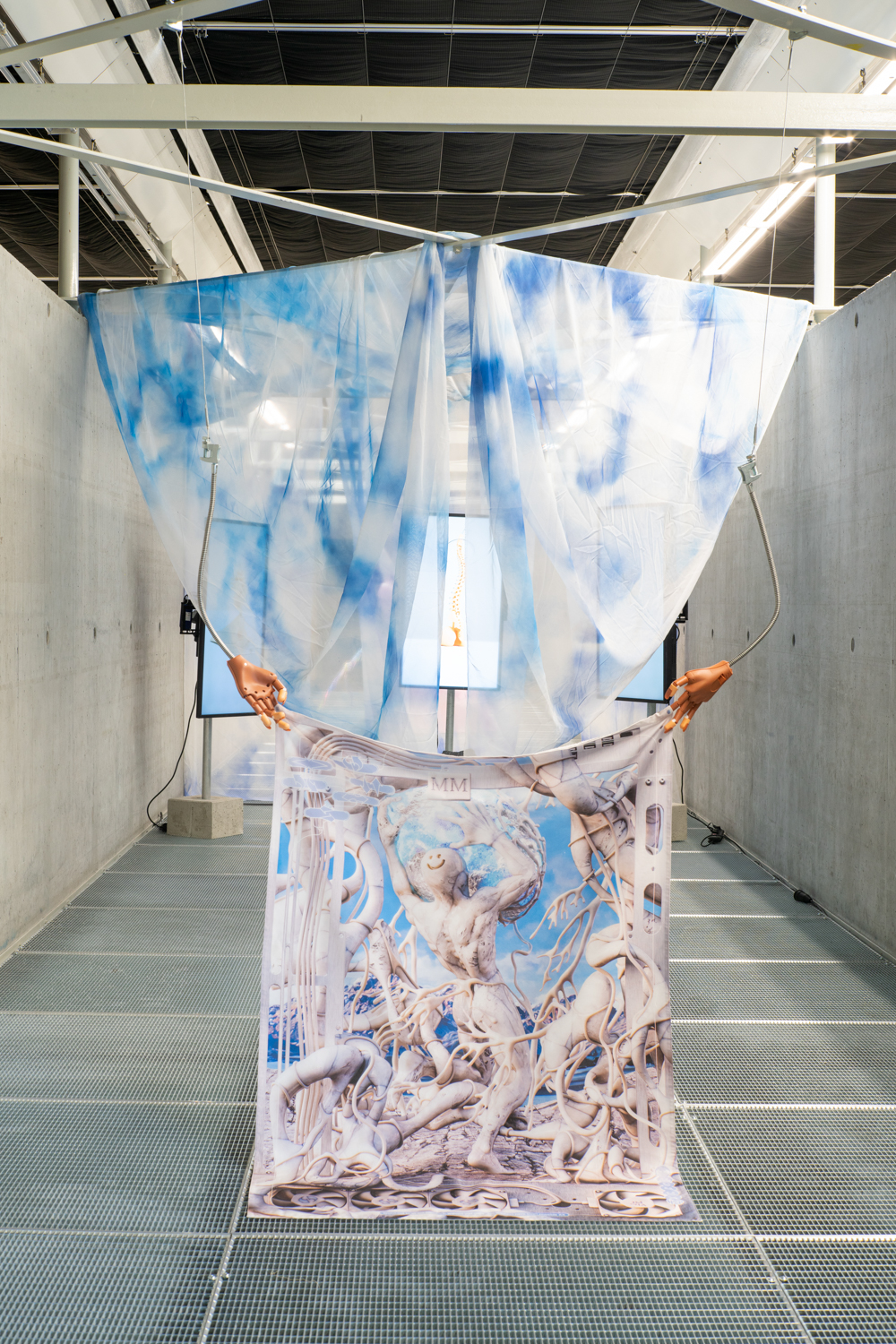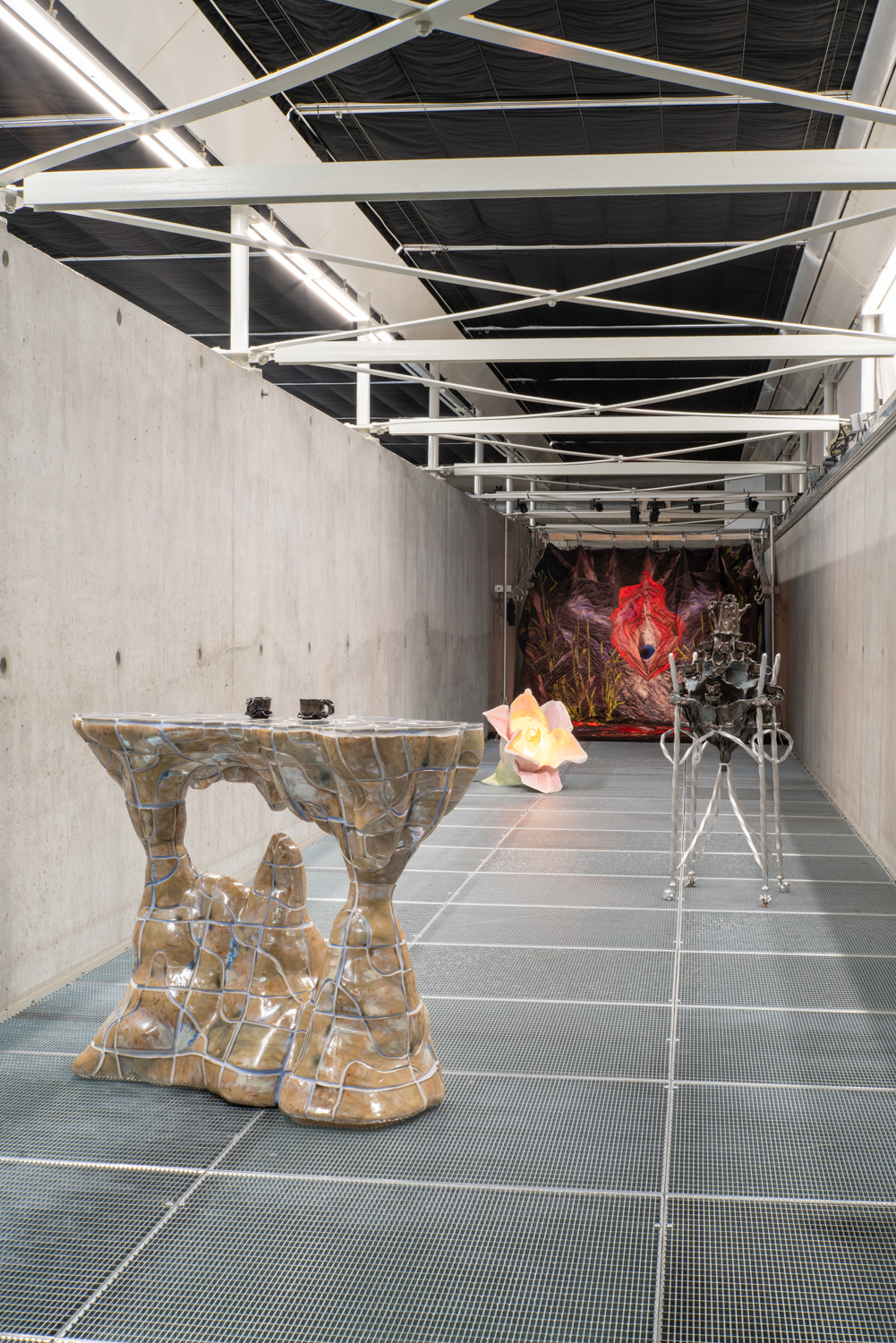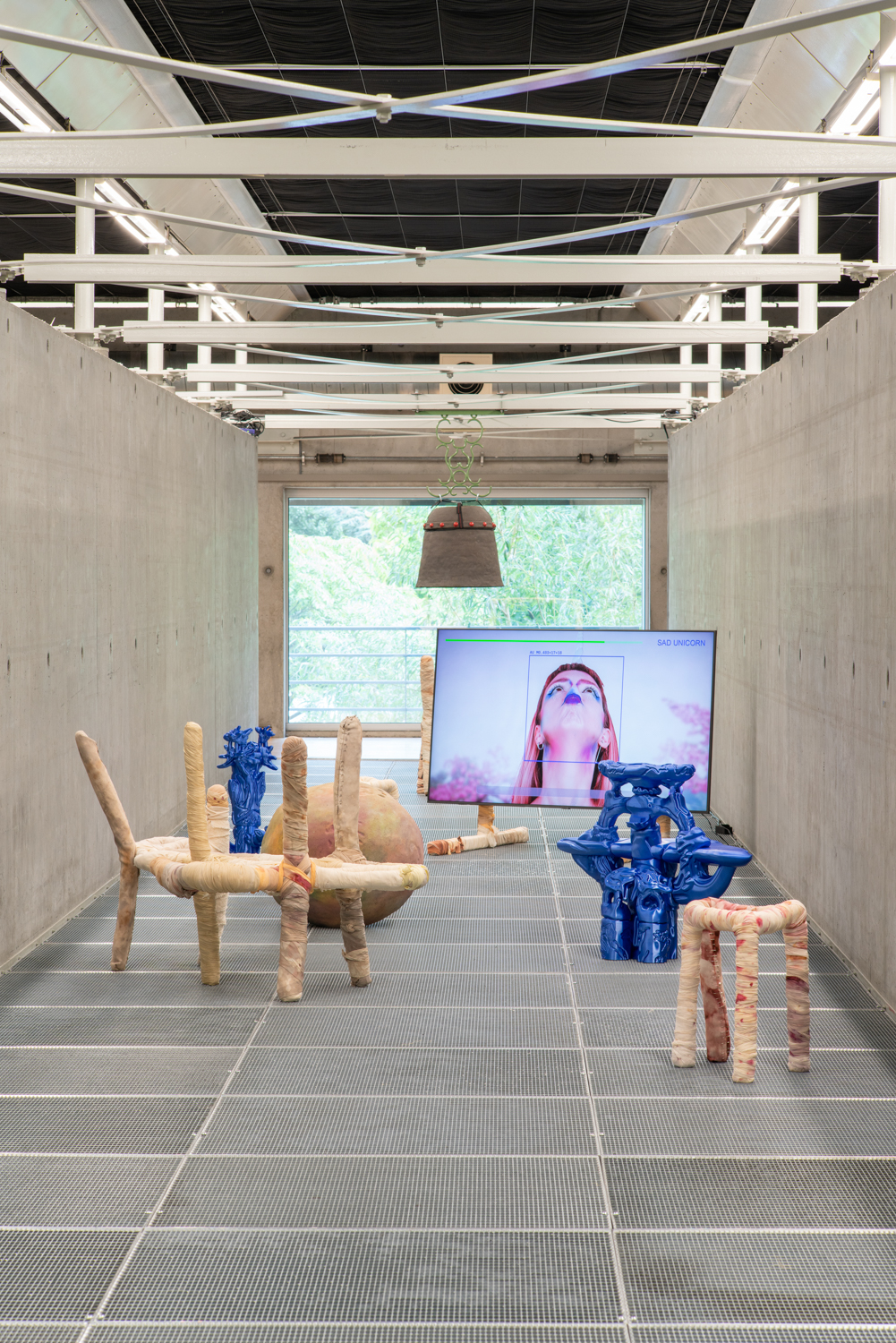 Disorientation happens when our senses slip off the atlas of common knowledge; it is also an invitation to know differently. Without a visual reference like a stable horizon, humans rely on the non-visual senses to re-ground themselves. It Enters Into What We Become (Centre for Disorientation), a new presentation of work by multidisciplinary design collective Morph.Love in Het Nieuwe Instituut’s Gallery 3, is an invitation to lose ourselves inside a total environment. Eighteen members of the ever-evolving international group explore disorientation by creating a looping sequence of multisensory encounters. Arranged as five porous sections that build and double-back on each other to create an exploratory labyrinth, It Enters Into What We Become meditates on a cryptic healing process that never fully makes itself known. From an exploration of how algorithms alchemise emotional expressions into hard cash, to a chilly digital fire that bucks our sensory codex, and a trippy VR voyage through the body, the exhibition extends this sense of disorientation through a sequence of abstracted wellness rituals. It Enters Into What We Become rejects the linear-progressive spatial flow typical of exhibitions, instead choosing to end where it begins. Following the intense virtual yogic foray into a body grotto, viewers are shuttled through an express passage back to the entrance. Here, the supersensory ‘we’ built throughout the different rooms begins to slacken back into an ‘I’: viewers recover from their intense journey before re-entering the world. Conceived as a collaborative transformative process, Morph.Love’s latest presentation reframes disorientation as an eternal state of becoming. (Photos by Donghwan Kam & Koos, Graphics by Lana Arih)