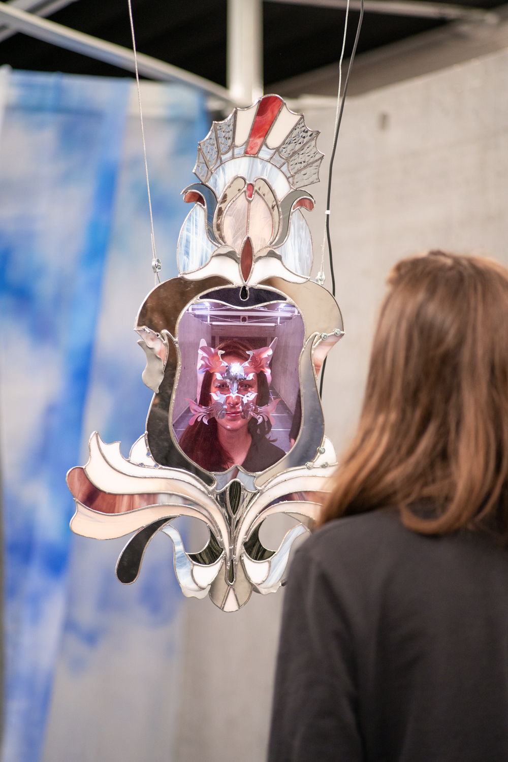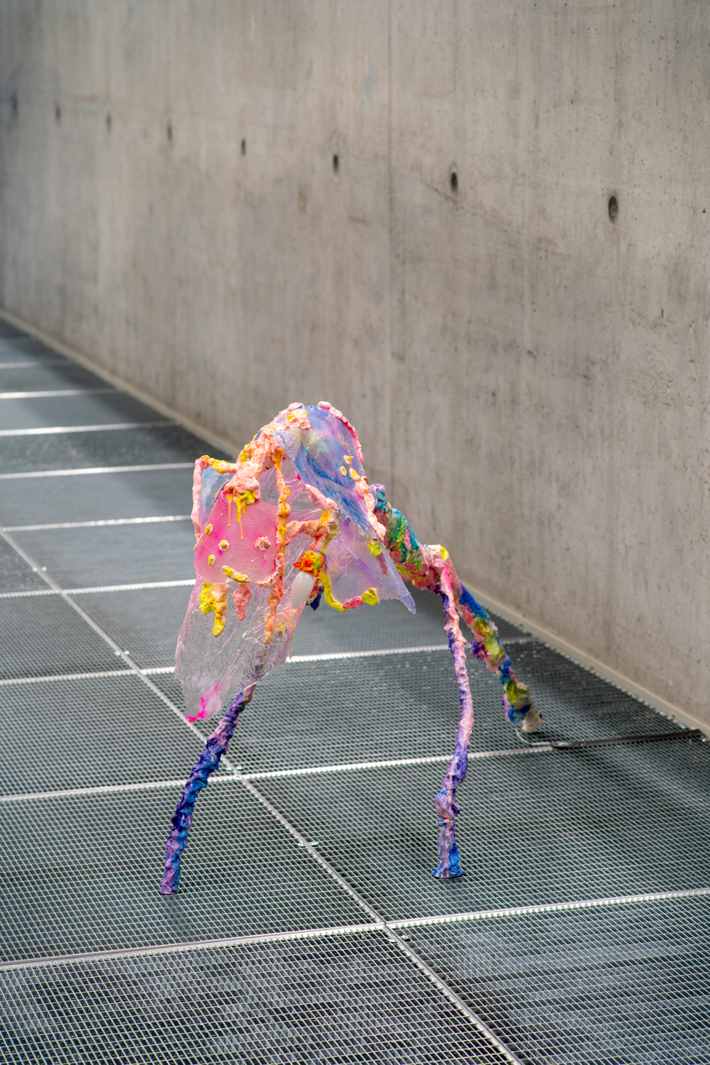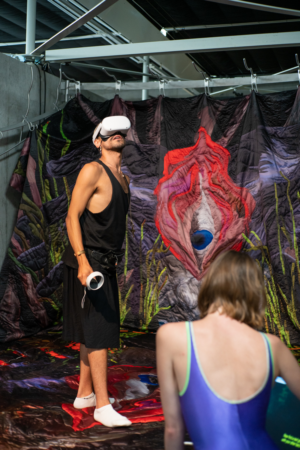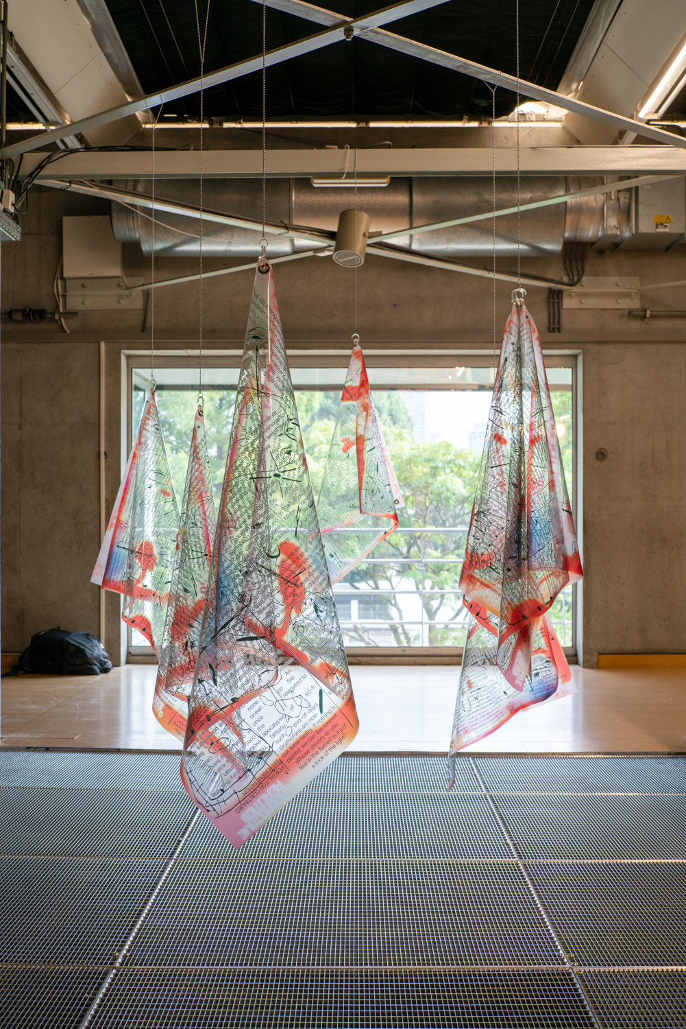 Disorientation happens when our senses slip off the atlas of common knowledge; it is also an invitation to know differently. Without a visual reference like a stable horizon, humans rely on the non-visual senses to re-ground themselves. It Enters Into What We Become (Centre for Disorientation), a new presentation of work by multidisciplinary design collective Morph.Love in Het Nieuwe Instituut’s Gallery 3, is an invitation to lose ourselves inside a total environment. Eighteen members of the ever-evolving international group explore disorientation by creating a looping sequence of multisensory encounters. Arranged as five porous sections that build and double-back on each other to create an exploratory labyrinth, It Enters Into What We Become meditates on a cryptic healing process that never fully makes itself known. From an exploration of how algorithms alchemise emotional expressions into hard cash, to a chilly digital fire that bucks our sensory codex, and a trippy VR voyage through the body, the exhibition extends this sense of disorientation through a sequence of abstracted wellness rituals. It Enters Into What We Become rejects the linear-progressive spatial flow typical of exhibitions, instead choosing to end where it begins. Following the intense virtual yogic foray into a body grotto, viewers are shuttled through an express passage back to the entrance. Here, the supersensory ‘we’ built throughout the different rooms begins to slacken back into an ‘I’: viewers recover from their intense journey before re-entering the world. Conceived as a collaborative transformative process, Morph.Love’s latest presentation reframes disorientation as an eternal state of becoming. (Photos by Donghwan Kam & Koos, Graphics by Lana Arih)