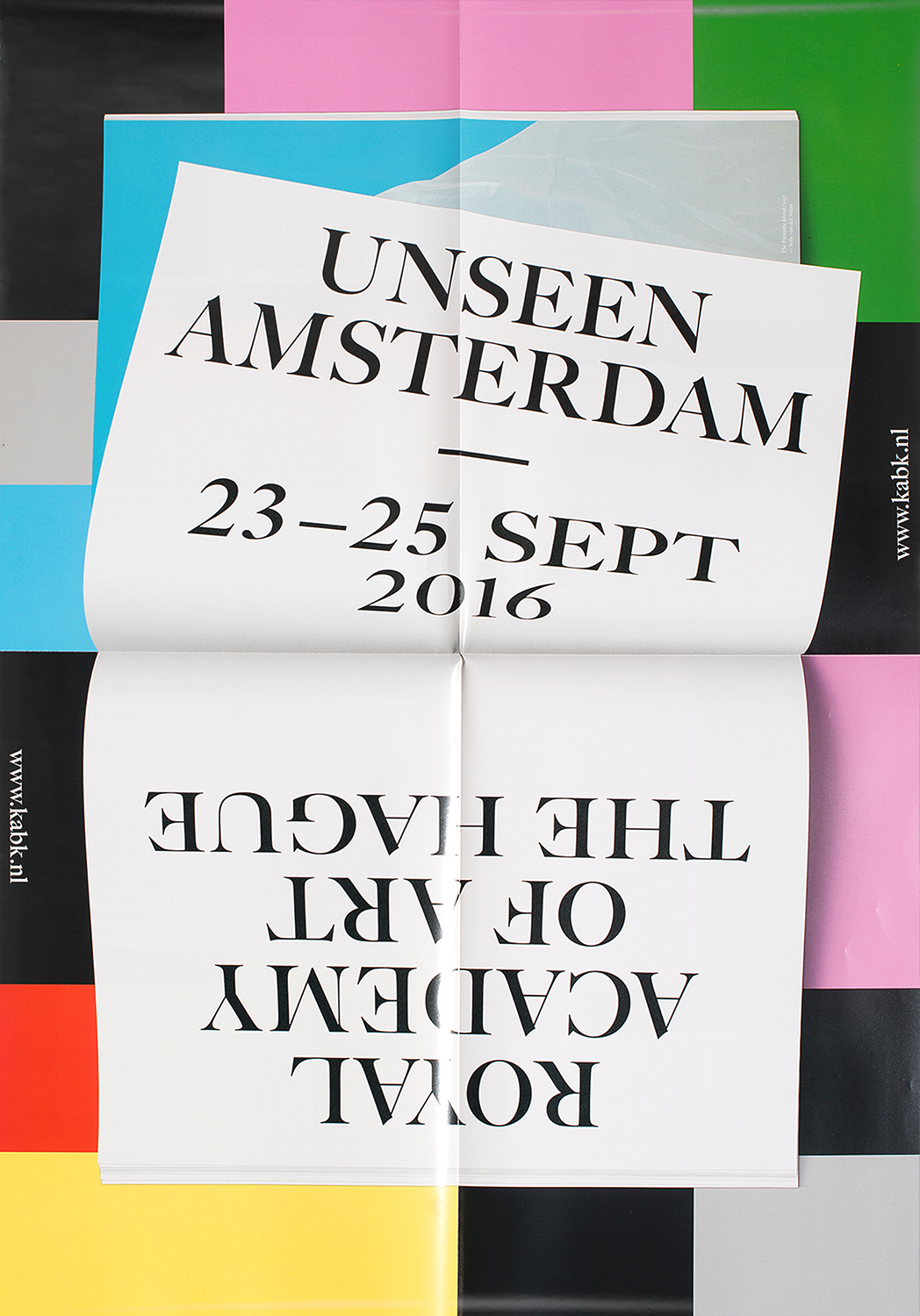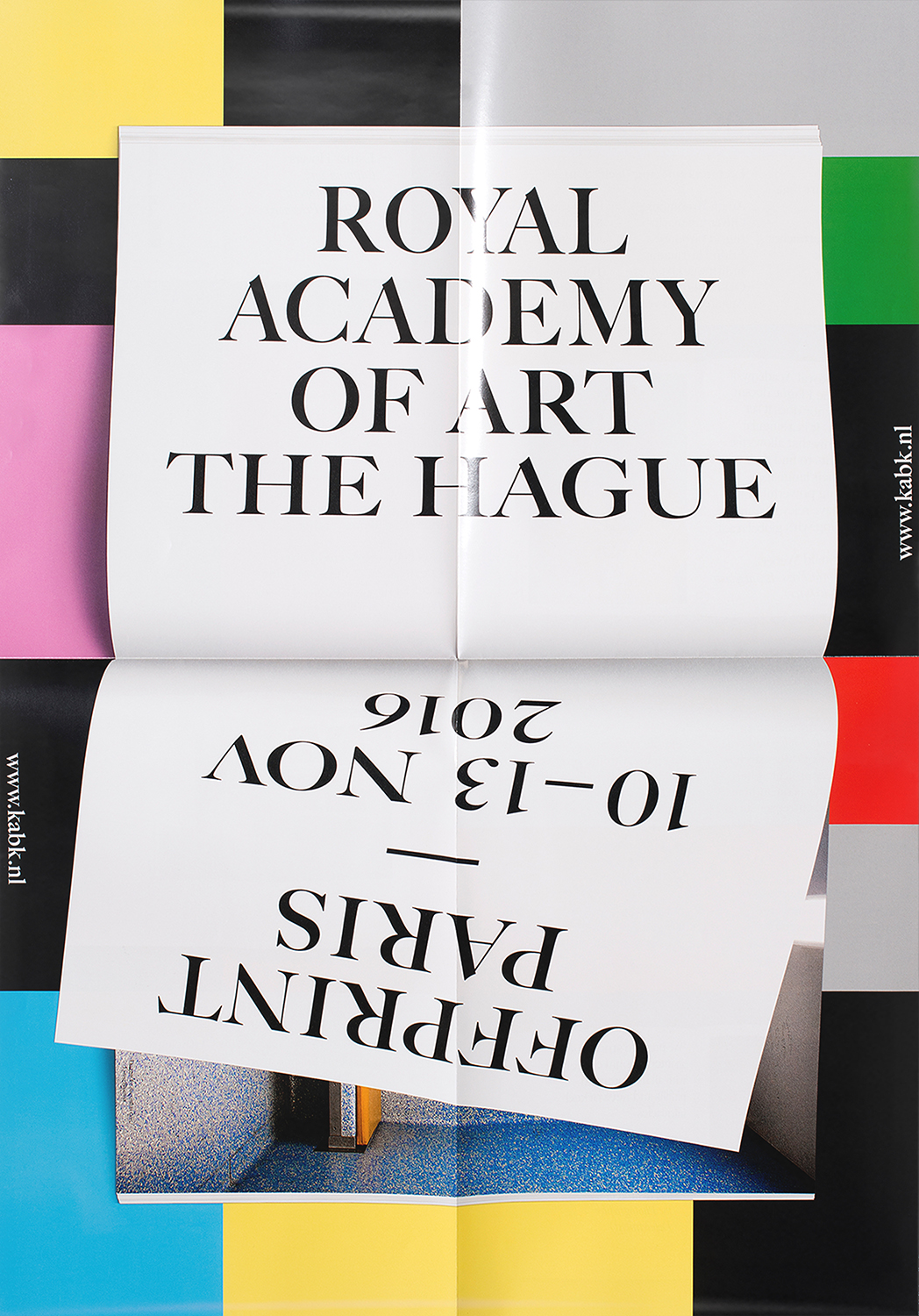 KB16.020 Title: Offprint (2016). Commissioner: Royal Academy of Art The Hague. Dimensions: A2 folded to A4. Items: poster series, table cloth. Techniques: offset (posters), sublimation print on textile (table cloth).